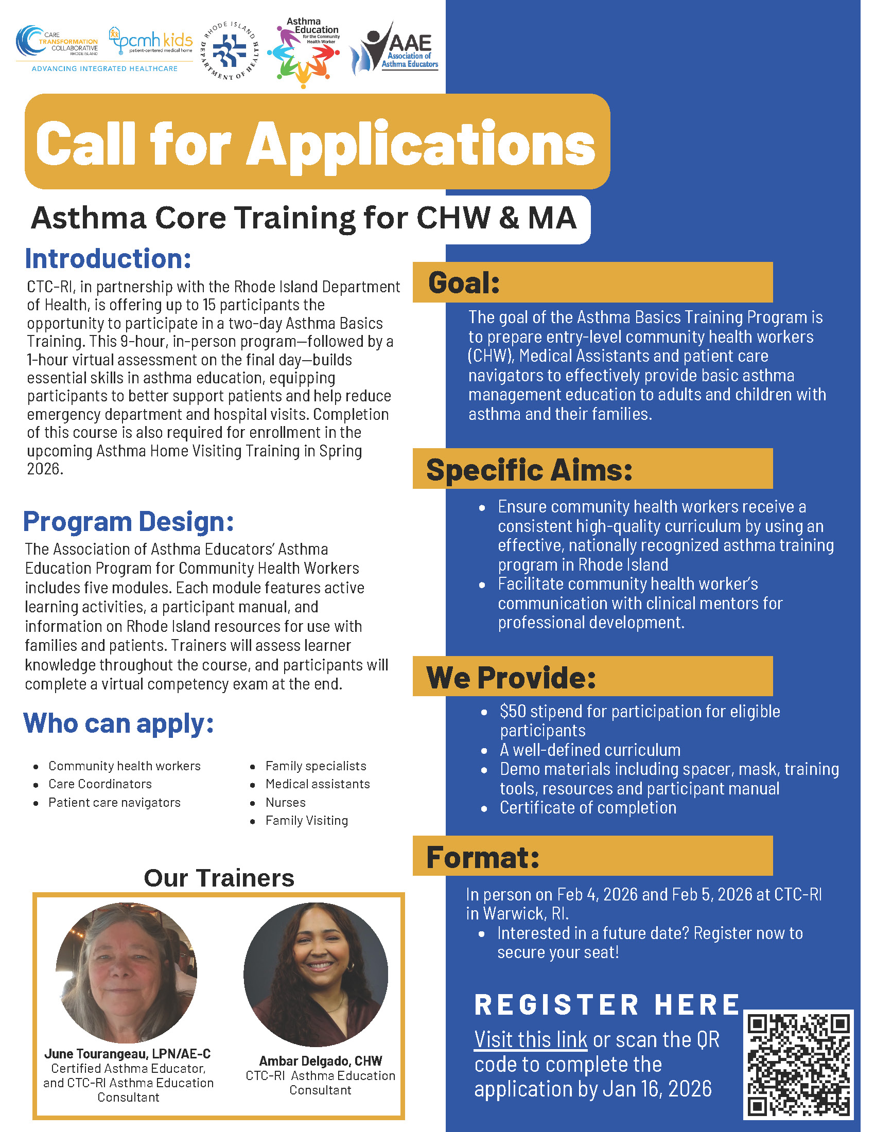 CTC-RI and RIDOH invite 15 participants to take a 2 day Asthma Basics Training on Feb 4th & 5th, 2026.