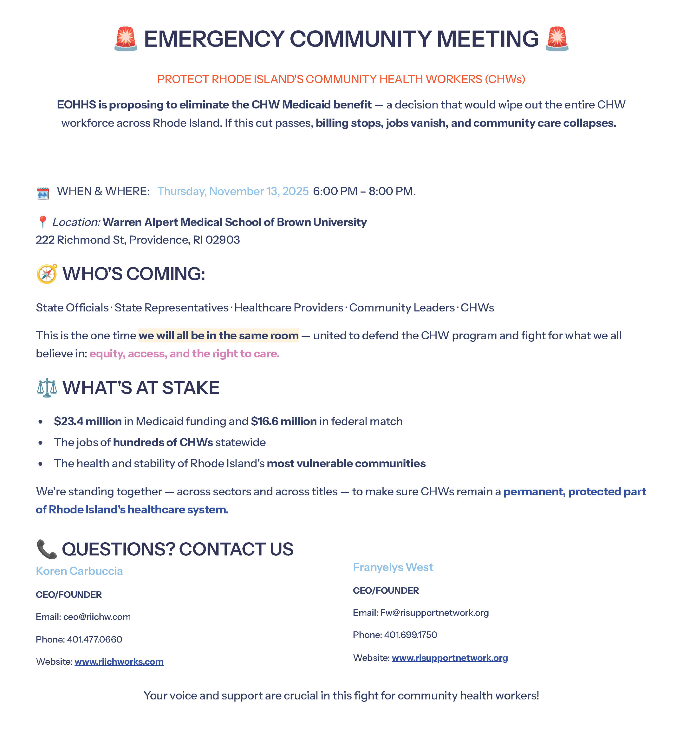 This important gathering has been organized by RI Independent Community Health Works and the RI Support Network. Attend to make your voice heard! EMERGENCY COMMUNITY MEETING PROTECT RHODE ISLAND'S COMMUNITY HEALTH WORKERS (CHWs) EOHHS is proposing to eliminate the CHW Medicaid benefit, a decision that would wipe out the entire CHW workforce across Rhode Island. ... |