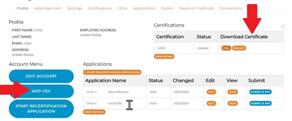 - Utilize website tools! Once you create an account, within your portal you can download your certification certificate AND upload CEUs. This way as you walk out of a training, you can take a picture of your certificate, upload it, and then it’s done. The date and hours will be recorded for your re-certification records! You can check a certification expiration date under “Certification, Verify a Credential.”